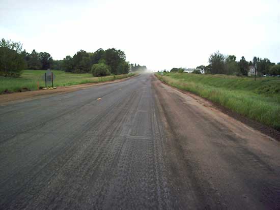 Coming out of Pine City, I encountered the worst roads of the trip. The sign said, ‘Road construction next 4 miles.’ The pavement had been ground down in preparation for a new layer and made for a lousy surface to pedal on. The shoulder was a hard-packed sand and gravel mix, which I used instead. The sand got very soft a few times, and I nearly lost control as my front tire dug into it. I spent my time alternating between the two surfaces. Just when I figured that 4 miles were about through, I came upon another sign which said, “Road construction next 5 miles.’ Maybe it was better they broke the news to me in short increments rather than the whole 9-mile warning at one time. I could do another 5 miles, but I was hoping I wouldn’t find another similar sign 5 more miles up the road. I didn’t.